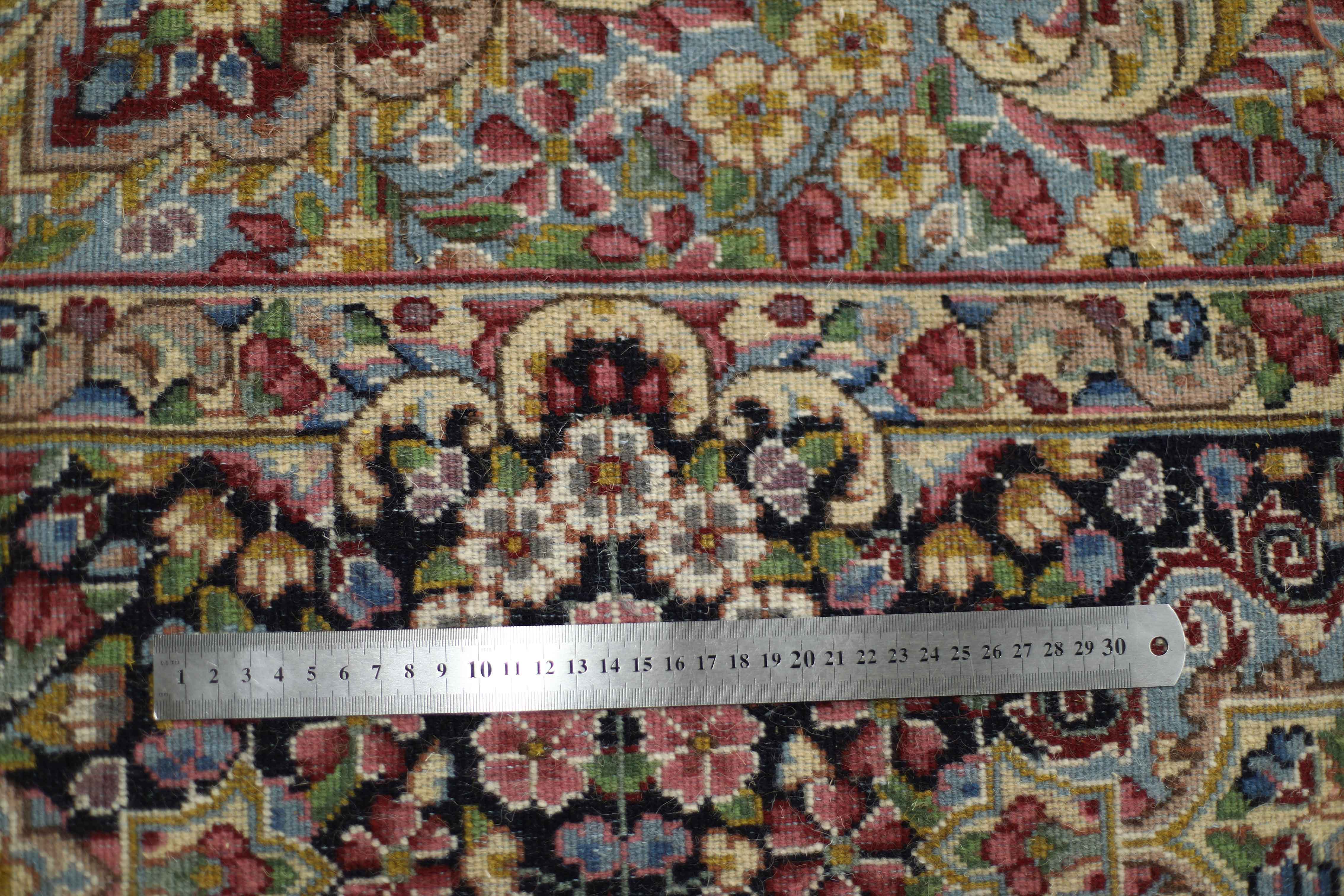 لازم به توضیح است این قالی در زمان صدور شناسنامه روگیری نشده بود، لذا وزن و ضخامت آن به دلیل تغییراتِ پس از خدمات تکمیلی قالی، در شناسنامه ثبت نشده است و عکسها از پشت قالی تهیه شده است.